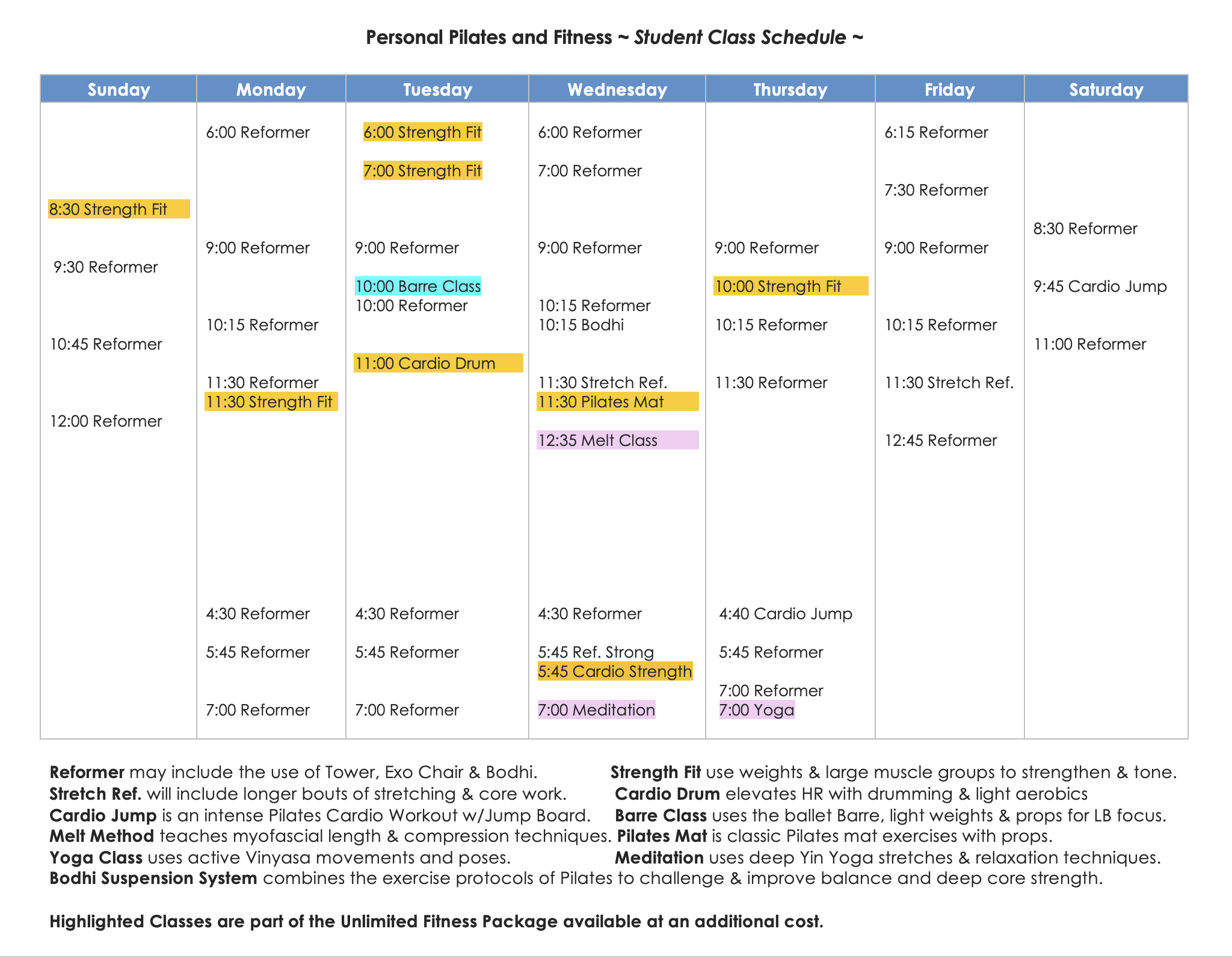 Our Class schedule is full of choices! New students: Introductory Classes are available on an individual basis. We are happy to accommodate your schedule. Please call the Studio today: 734-716-1476 to schedule an introductory class to experience & learn how Pilates Classes will help strengthen, tone, lengthen and transform how your body feels and performs. Choose a day and time to create your own class or join one from the schedule below. Bring a friend!!!
